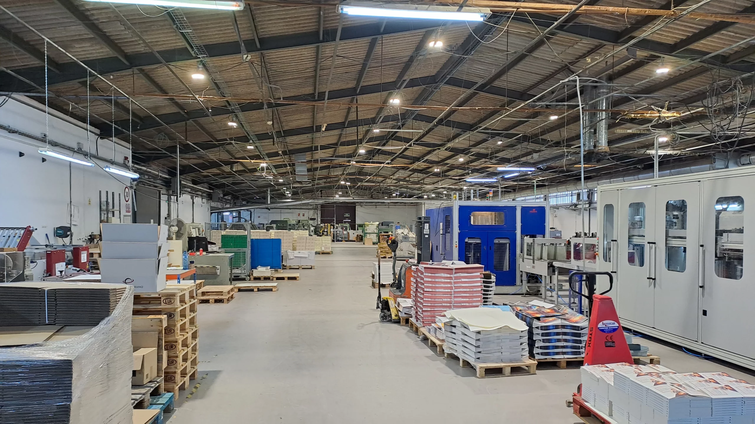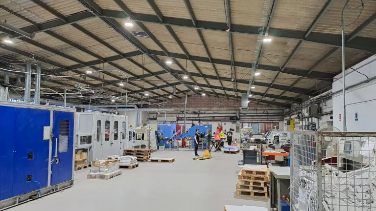 En este proyecto, hemos realizado una actualización completa del sistema de iluminación en una imprenta, sustituyendo las antiguas lámparas de halogenuro metálico por una moderna instalación de iluminación LED industrial. Esta mejora no solo ha optimizado la calidad de la luz en las instalaciones, sino que también ha integrado tecnologías avanzadas de automatización mediante detectores de presencia.